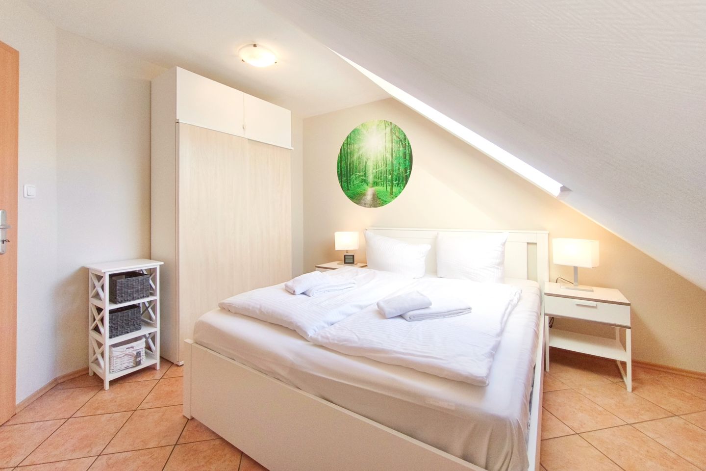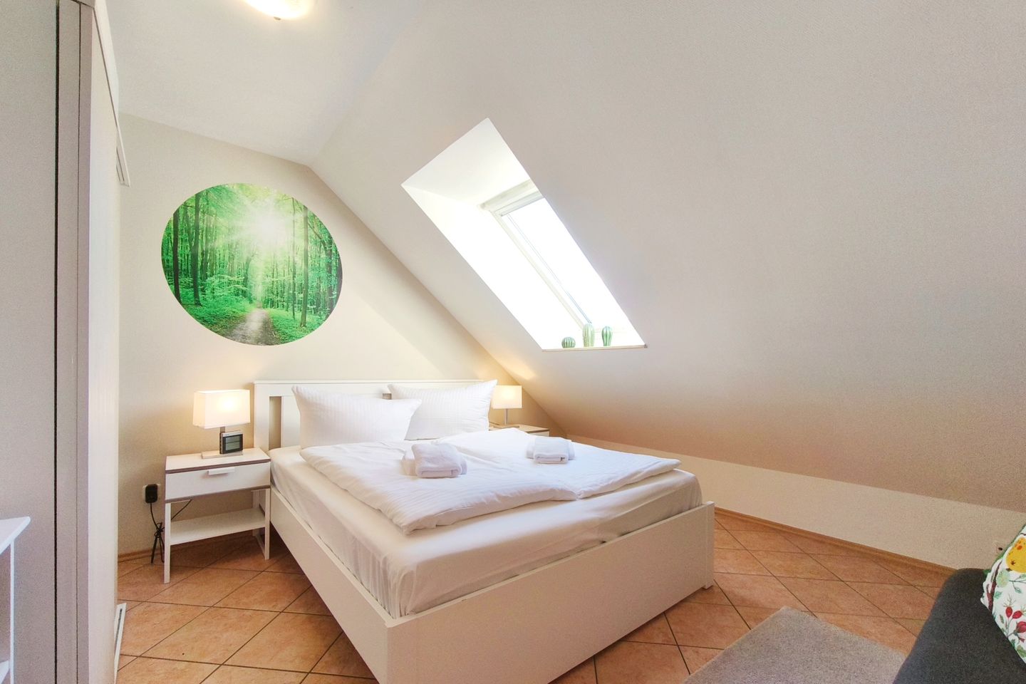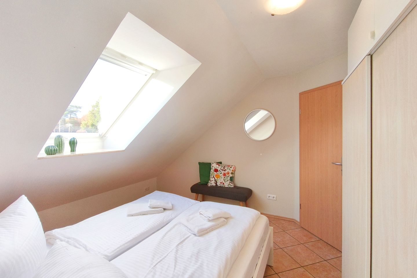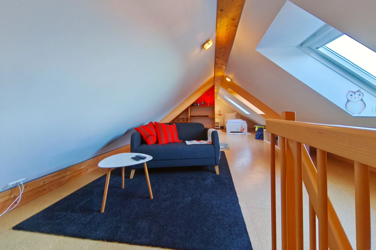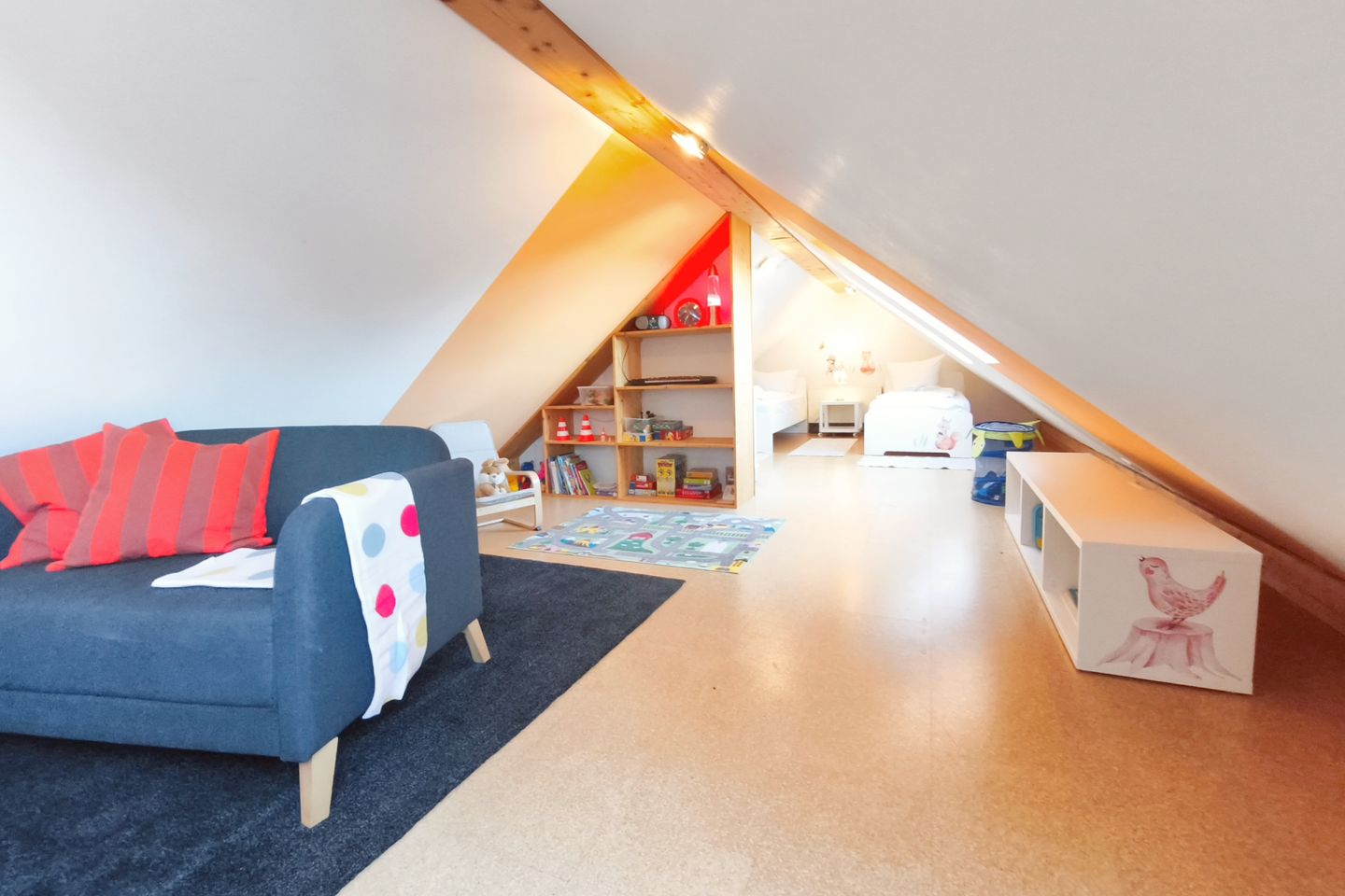 Für zusätzliche Sicherheit ist die Treppe mit einer kindersicheren Tür ausgestattet. So haben Ihre Kinder im Obergeschoss ihr eigenes kleines Reich, in dem sie sich ungestört entfalten können, während Sie im unteren Bereich der Wohnung entspannen. Auch Erwachsene können hier übernachten, jedoch beträgt die Zimmerhöhe in der Mitte maximal 1,90 m aufgrund der Dachschrägen.