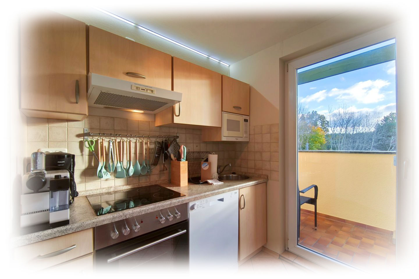 Die Küche bietet ausreichend Platz, um alle nötigen Vorbereitungen zu treffen, sei es für ein ausgiebiges Frühstück oder ein gemütliches Abendessen. Auch von der Küche aus haben Sie Zugang zum Balkon, was das Kochen in dieser Ferienwohnung noch angenehmer macht.