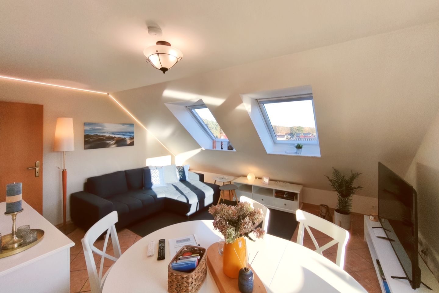Ein TV sorgt für Unterhaltung, und der ausziehbare Esstisch bietet genügend Platz für gemeinsame Mahlzeiten. Von hier aus gelangen Sie direkt auf den langen Balkon, auf dem Sie frische Luft und den Blick in die Umgebung genießen können.